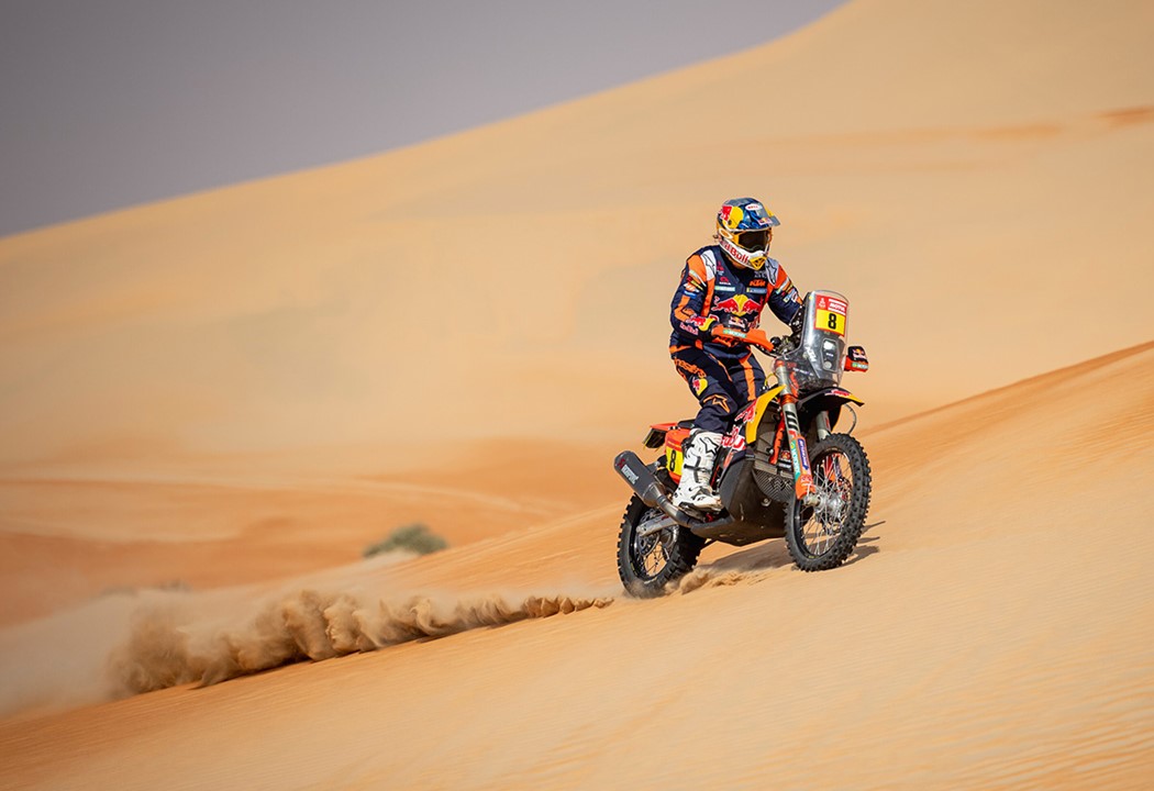 A etapa com um total de 426 km e 273 km em disputados em contra-relógio foi a terceira ganha por Luciano Benavides da Husqvarna, (acima) que estava naturalmente incrédulo no final, ao acabar 1 minuto e 38 segundos à frente de Daniel Sanders da GasGas.