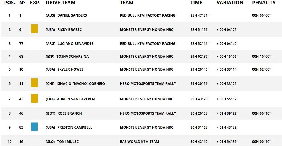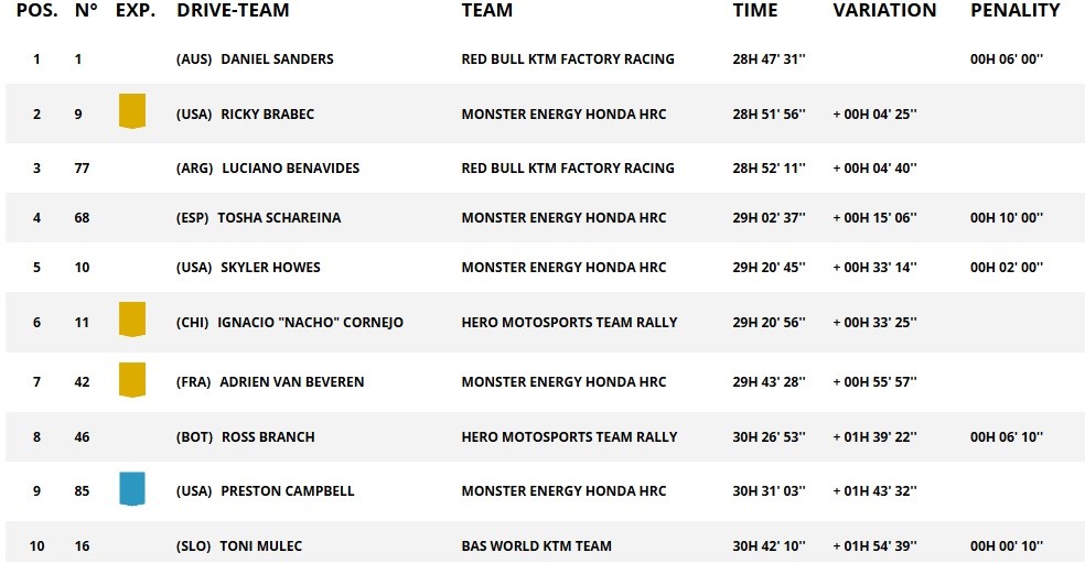 Nas duas rodas nada está definido, mas Sanders (#1) conseguiu reforçar a sua liderança com o 4.º lugar nesta etapa, tendo um tempo total de 28 horas e 37 minutos e 41 segundos. Brabec (#9) está um pouco mais longe com mais 4 minutos e 25 segundos e Benavides (#77) fecha o top 3 com mais apenas 15 segundos que o norte-americano.