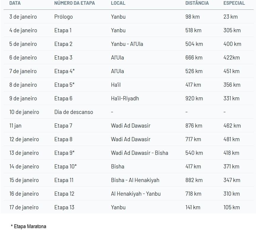 A primeira etapa da prova, com início e fim também em Yanbu e um percurso do tipo circular, vai ser dura: vão ser 518 km, dos quais 305 km são de Especial, com trilhos muito pedregosos.