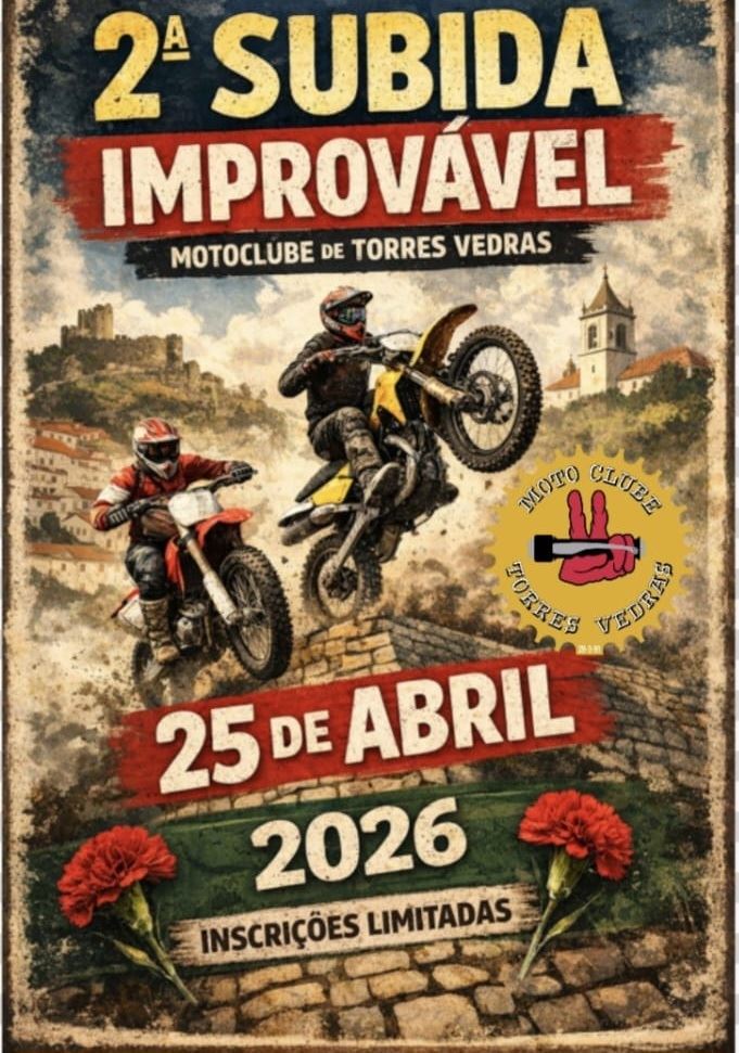 Depois do sucesso que foi a 1.ª Edição da Subida Improvável em Torres Vedras, no ano passado, o Motoclube de Torres Vedras tem tudo praticamente pronto para repetir o evento. Assim, no próximo dia 25 de abril, sábado, quem quiser tomar parte nesta grande festa, seja como piloto ou espetador, deve reservar já a data.