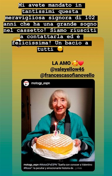 Italica Grondona tornou-se num símbolo da luta contra o Covid-19. Aos 102 anos de idade recuperou da infeção e tinha apenas o desejo de conhecer Valentino Rossi. O piloto italiano não recusou e cumpriu o sonho de Italica.