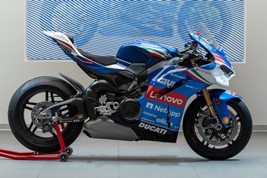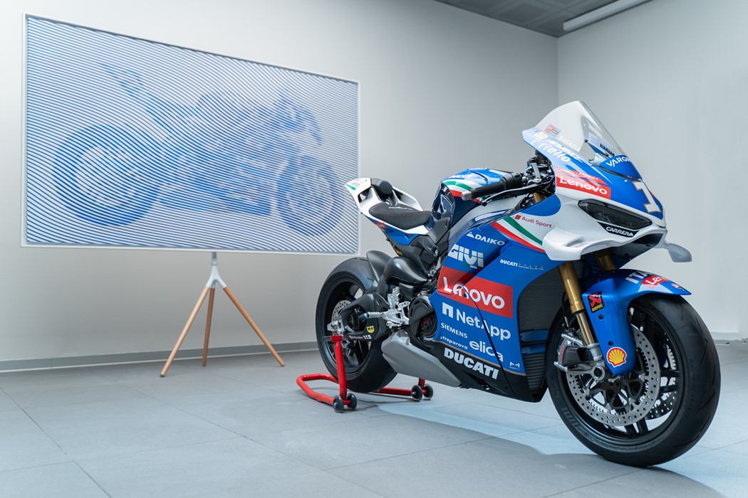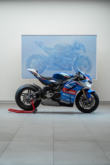 Esta obra foi inspirada na Panigale V4 Tricolore Italia, uma moto para colecionadores, numerada e de edição limitada de apenas 163 unidades apresentada em março passado no Ministério das Empresas e Made in Italy. Um modelo que celebra a cor Azzurro dos equipamentos das equipas desportivas nacionais italianas, a mesma cor com que a Ducati conquistou o primeiro e segundo lugar no Grande Prémio de Mugello em 2024.