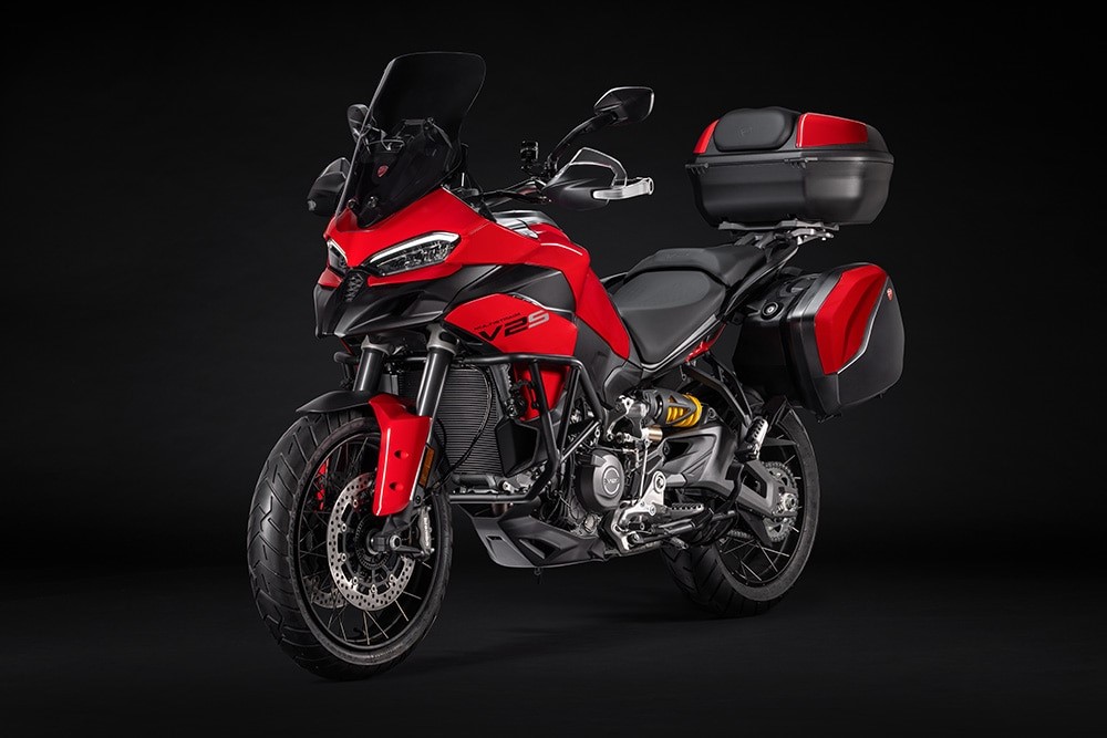 A Multistrada V2 foi criada para proporcionar prazer de condução, combinando versatilidade, performance e atitude turística. Para melhorar esta última, pode recorrer ao catálogo de acessórios originais, começando pelo pack Touring, que inclui malas laterais com os respetivos suportes, descanso central e punhos aquecidos.