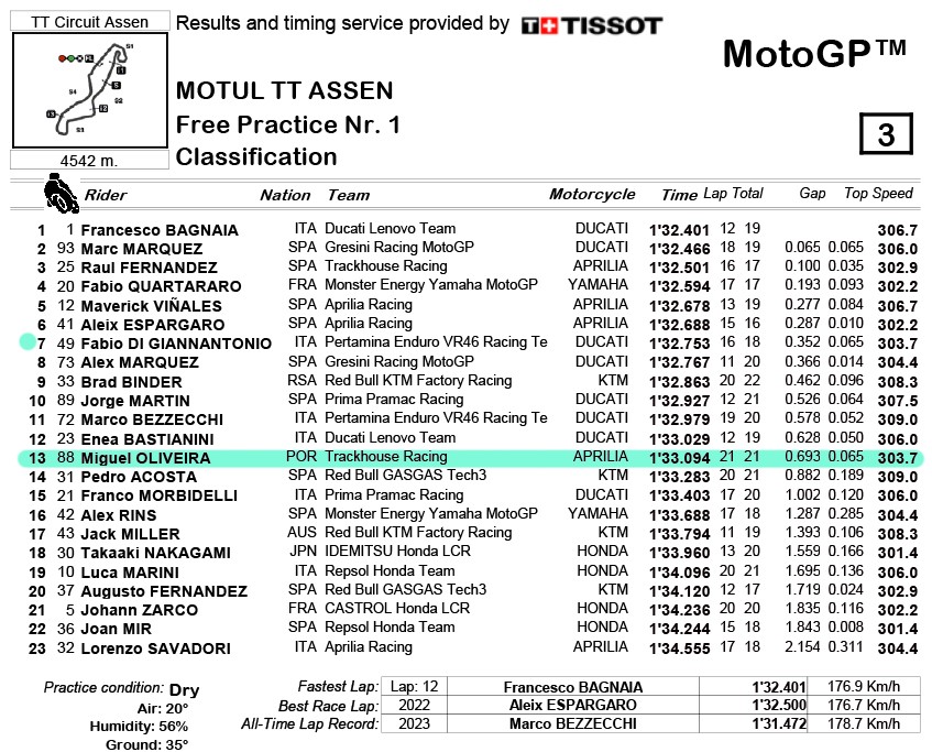 Oliveira tinha feito um esforço que apenas o levou a 13º de novo, e o rookie da VR46 acabaria mesmo como o mais rápido da sessão com 1:32.314 até a prepotência dos comissários ter entrado em ação e a volta ter sido cancelada por uma infração de limites de pista que nunca aconteceu… restituindo o tempo inferior de Bagnaia de 1:32.401 como o mais rápido…