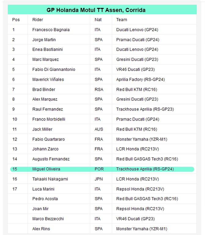 Acosta cai, Márquez passa Viñales para 4º e Oliveira ainda pontua em 15º… ainda por cima, Viñales foi penalizado por pisar ligeiramente o limite da pista, ascendendo DiGia a 5º...