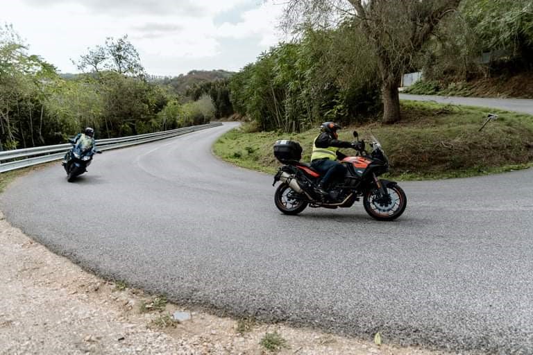 Depois, precisamos de saber o que fazer com essa nova postura melhorada. Primeiro, uma explicação teórica sobre as trajetórias de segurança que devem ser seguidas quer na curva à direita quer na curva à esquerda. Um aspecto em particular merece a nossa atenção: nas curvas à esquerda tendemos a aproximarmo-nos demasiado do eixo da via. Com a inclinação natural em curva, a parte superior do nosso corpo e esse lado da moto ficam expostos a algum veículo que venha em sentido contrário. Um erro que muitos cometemos!