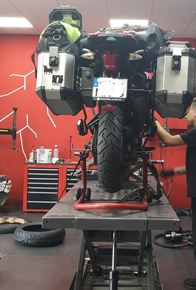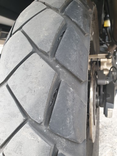 Saí da mota e cheia de bazófia fui investigar até onde o pneu estava marcado, já tinha provado as primeiras curvas de montanha e a coisa tinha corrido bem. Surpresa das surpresas, pneu a desfazer-se! Literalmente. Fiquei em choque! Uma das coisas que aprendi de imediato foi a importância de ir verificando os pneus. Claro está, eram 18 h e sabia que as oficinas fechavam, entro pelo hotel esbaforida, vou à receção e pergunto, onde há aqui uma loja de pneus de moto?