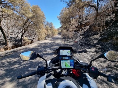 E foram tantos quilómetros de terra queimada! A luta com o fogo deve ter sido feroz, porque havia pedaços de terra lavrada e algumas casas ao longe que foram protegidas por contra-fogos. Nitidamente tinham pegado fogo a arbustos menores junto de habitações e terrenos de vinha e fruta, para que o incêndio maior não passasse, e ele contornou e seguiu.