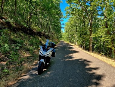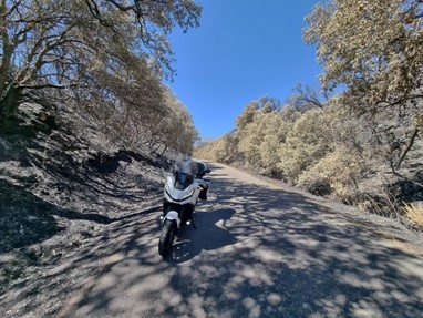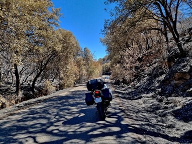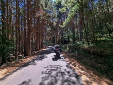 No caminho para o meu destino decidi ir pelo parque Natural de Moncayo. O dia estava quente, eu já tinha o rosto a ficar queimado, porque como não conseguia abrir e fechar o capacete, mantinha-o aberto, por isso achei que andar pelo meio da natureza, entre arvores e sombras, seria fantástico!