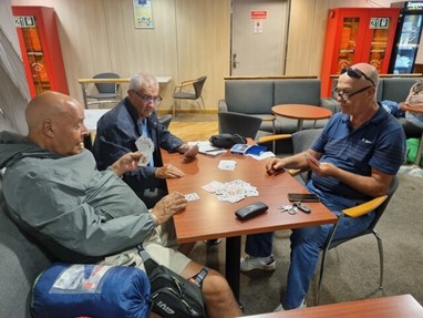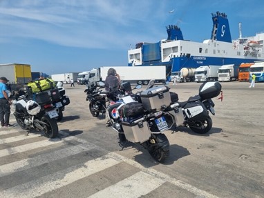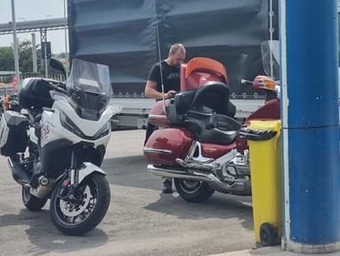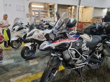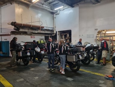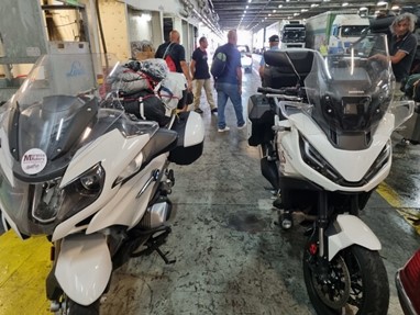 Supersimpáticos, fartaram-se de tagarelar comigo enquanto esperávamos e, quando entrámos no terminal, juntámo-nos a outros motociclistas que tinham entrado direto e já estavam à espera, foi um tempo de espera muito mais interessante e animado. Depois percebi que o tipo carrancudo da Gold era mesmo carrancudo com toda a gente. Não trocou nem uma palavra com ninguém. É raro encontrar um viajante solitário com ar de poucos amigos e pouco sociável, mas que eles existem, existem!