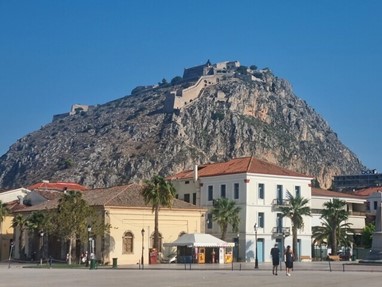 E lá estava Náuplia, com a sua fortaleza de Palamidi no topo do monte. Seguramente que eu não subiria lá acima. É daquelas coisas que eu prefiro apreciar cá de baixo, embora imaginasse que o golfo e a cidade vistos lá de cima deveriam formar uma paisagem impressionante. Mas com aquele vento todo, a subida com curvas, carros e camionetas à mistura, e a minha mão a doer cada vez mais e a perder a força… eu não arriscaria!