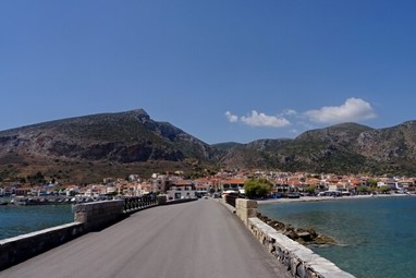 A vila está ligada a terra por um istmo, que curiosamente é uma palavra de origem grega e que quer dizer pescoço em português.