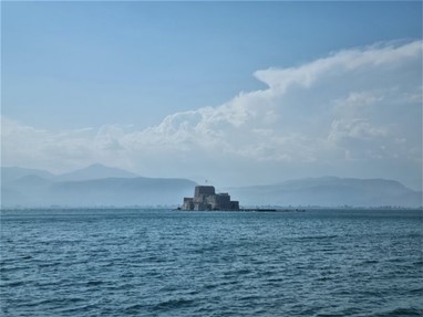 E o castelo de Bourtzi, no meio do mar! Tal como a fortaleza no monte, o castelo é veneziano. Bourtzi significa torre em turco, e é o que o castelinho é, uma torre no meio das águas do porto.