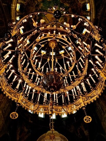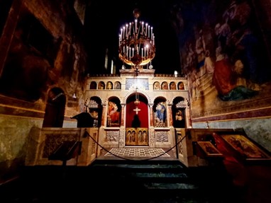 O interior apresenta uma planta em forma de cruz grega, com ícones religiosos decorando as paredes e tetos.