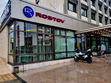 Não há forma de uma pessoa não se sentir um bocado miserável quando viaja à chuva. Sobretudo quando sabe que está a atravessar uma zona bonita, com um rio onde se pode caminhar e fazer fotos giras… Mas com aquele tempo não dava para esses devaneios, por isso lá fui seguindo ao som da minha música, até que uma construção encantadora me fez parar! Era o Ресторант “Родина” – em tradução macaca do Google – Restaurante “Rodina”.