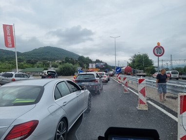 E lá cheguei à ponta de uma fila de carros que, certamente, era para passar a fronteira. Felizmente não chovia, mas, mesmo assim, fui furando tanto quanto pude até chegar aos separadores que não deixavam espaço para a habilidade.