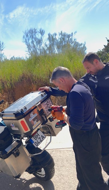 Sem outra opção, dirigimo-nos a uma oficina em Caria, onde fomos recebidos por um mecânico extremamente prestável que se viu obrigado a furar o canhão da mala para que pudéssemos aceder ao seu interior. Com isto, a mala ficaria permanentemente aberta durante a travessia dos 20 países planeados na nossa viagem. Apesar deste percalço, o mecânico ainda conseguiu fazer um arranjo provisório na mala lateral, permitindo-nos prosseguir.