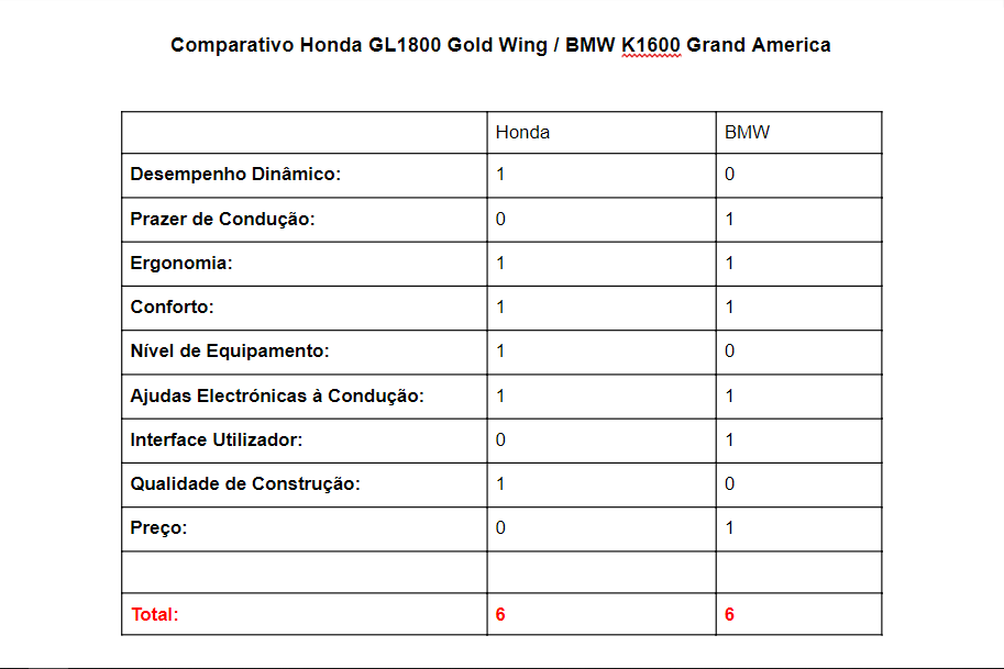 O resultado final deste comparativo é um empate. E justo. Efectivamente cada uma destas motos tem um carácter próprio, mas ambas cumprem na perfeição a tarefa de tragar quilómetros e quilómetros com conforto e muito estilo. Aliás a escolha deverá recair sobretudo numa questão de estilo, com a BMW a oferecer um design mais na moda, e a Honda a oferecer um estilo mais intemporal.
