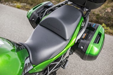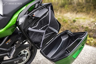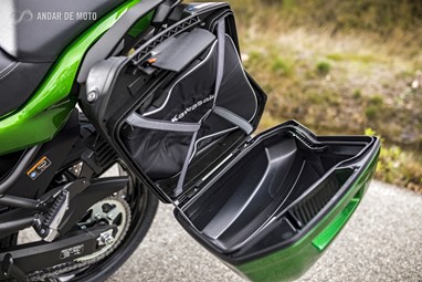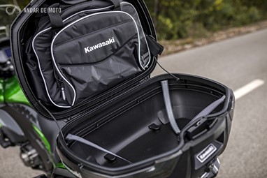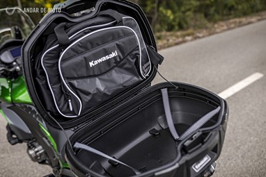 A funcionalidade também é grande. O quadro da nova Kawasaki Versys 1000 foi revisto, e reforçado, para potenciar o transporte de bagagem e garante uma capacidade de carga de 200kg. Por isso a versão SE Touring vem equipada de fábrica com 3 malas, sendo que a Top Case, com capacidade para 47 litros, pode carregar até 5kg de bagagem, e cada uma das malas laterais, capaz de guardar um capacete integral, tem capacidade para 28 litros, e também até 5kg de carga em cada uma.