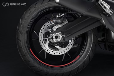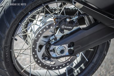 Na prática, todo o conjunto se revela leve e equilibrado, pelo que permite uma maior velocidade de passagem em curva, com níveis de confiança e segurança muito elevados. A travagem é potente, com uma mordida inicial delicada, a piscar o olho a pisos menos consistentes, e a manete, muito doseável, acciona em simultâneo o disco traseiro, distribuindo a fricção por ambos os eixos, mitigando, também assim, o afundamento de forquilha em travagem e potenciando a estabilidade.