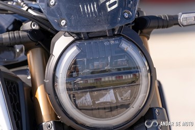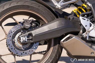 A afinação das suspensões da CB parece-me mais equilibrada do que na CBR, por uma pequena margem, é um facto. Provavelmente as afinações de fábrica da Honda adaptam-se melhor à posição de conduçõ da naked, em que a frente não suporta tanto peso, do que à da CBR650R, onde existe mais peso à frente fruto da geometria da posição de condução.