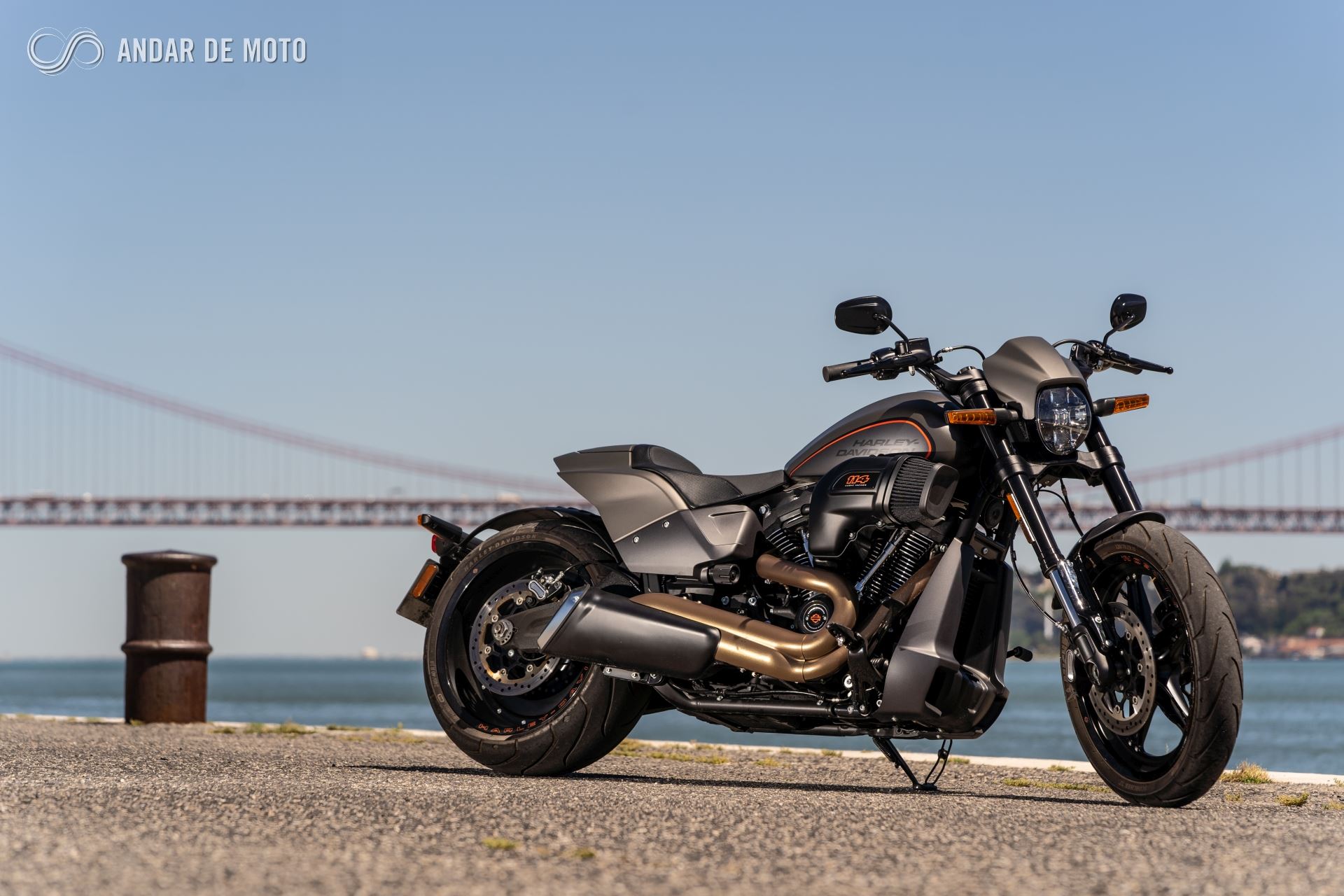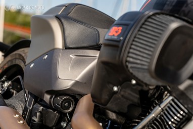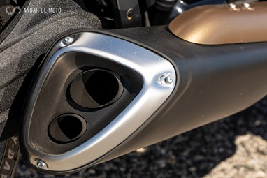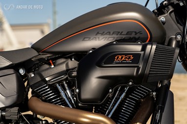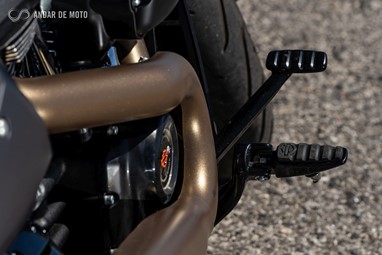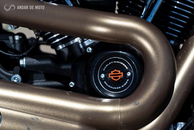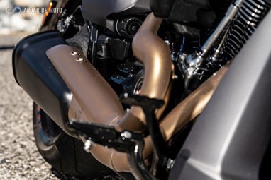 O lado direito da FXDR 114 é o mais dado a contemplações, pois a chamar a atenção sobre si está o proeminente filtro de ar e a linha de escape 2 em 1 que culmina numa ponteira de formato triangular com um impacto visual muito elevado.