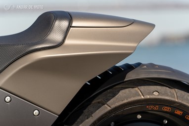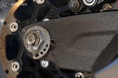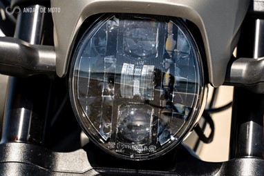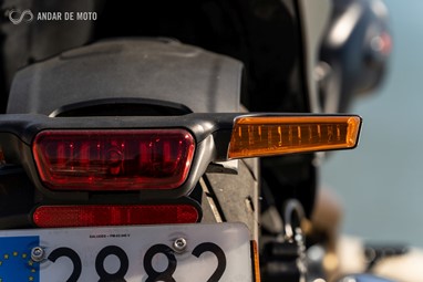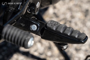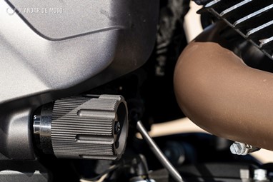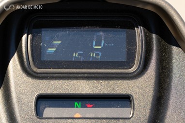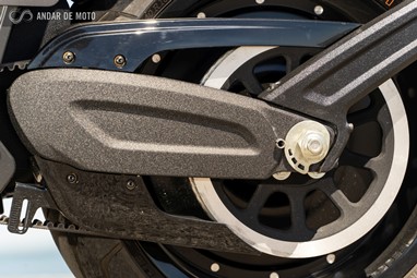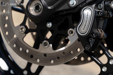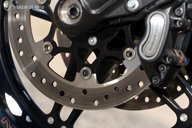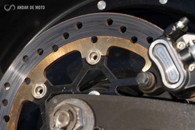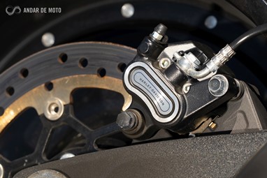 Já a forquilha invertida, de 43mm de diâmetro, apresenta um curso mais generoso, de 130mm, conseguindo ao mesmo tempo mostrar rigidez suficiente em curva, mesmo a alta velocidade, e disfarçar bastante bem o afundamento causado sob travagem, pela inércia dos cerca de 300Kg que o conjunto totaliza.
