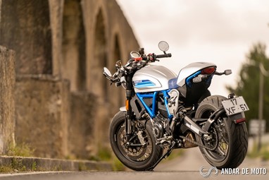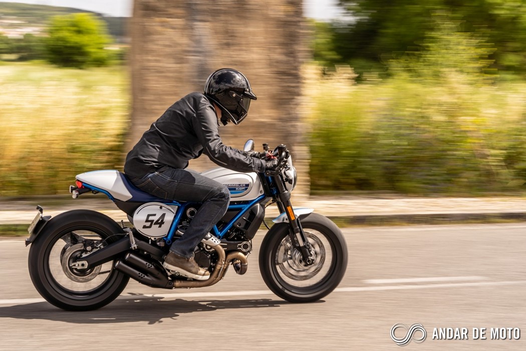 A Scrambler Café Racer é uma moto moderna mas à antiga, onde o que conta é o prazer puro de conduzir uma moto em que somos nós que controlamos, através da mão direita, como é que exploramos o motor bicilíndrico.E é uma delícia explorar este motor em L. Por ser ainda de refrigeração a ar, o Desmodue tem um comportamento algo rude a baixas rotações e principalmente quando a temperatura não é a ideal. Nesses momentos precisei de controlar o soluçar a baixas rotações usando, e abusando, da embraiagem, que sendo hidráulica senti-a mais leve do que me lembrava de outras Scrambler da Ducati. A caixa, por sua vez, sente-se mecânica, e embora precisa na subida de relações o que permite desfrutar plenamente da transmissão bem escalonada, nas reduções sente-se rija, com a embraiagem deslizante no entanto a digerir os maiores abusos impedindo o bloquear da roda traseira.