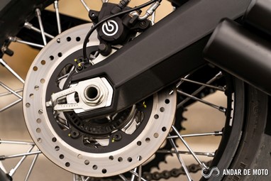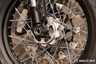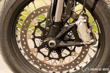 Com 330 mm de diâmetro e mordido por uma pinça Brembo de quatro pistões, o sistema de travagem da Scrambler Café Racer revelou-se doseável, potente. Não está nem subdimensionado nem sobredimensionado, pelo que podemos confiar plenamente nos travões desta Ducati para abusar dos pontos de travagem.
