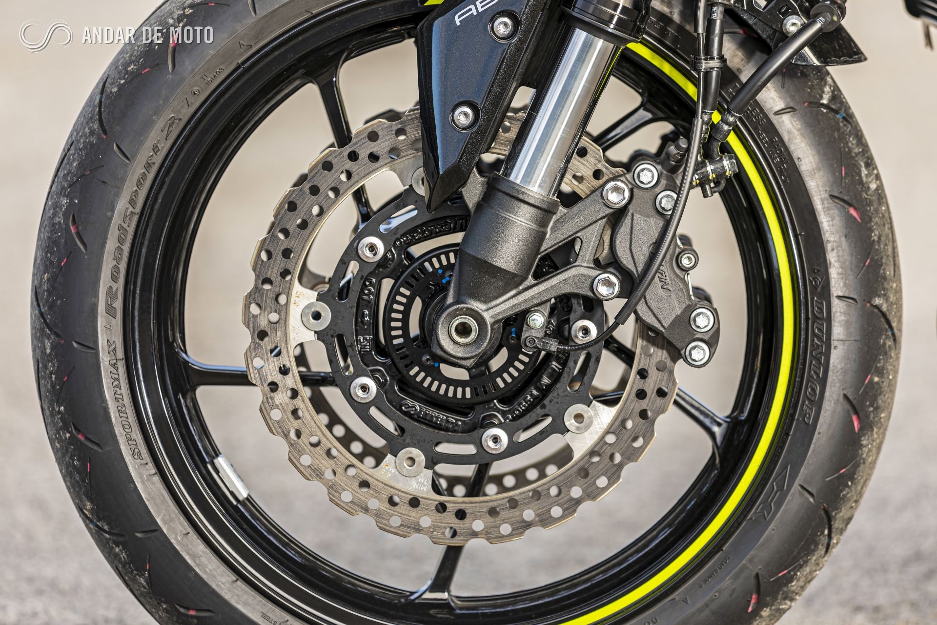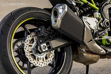 A marca faz questão de evocar os novos pneus Dunlop Sportmax Roadsport 2 que, na minha opinião, apesar de serem melhores que a versão anterior, são sem qualquer dúvida o ponto menos positivo da Z900. Difíceis de aquecer, transmitem pouca confiança na entrada em curva, perdem a aderência muito cedo sob forte travagem e acusam a entrega de binário, mesmo tendo em conta a suavidade com que o tetracilíndrico liberta os seus quase 100 Nm.