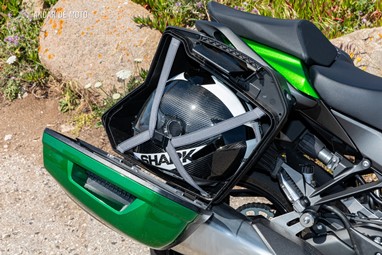 A versão testada, que pode ver nas fotos, contava com o pack Tourer, composto por ecrã grande, punhos aquecidos, suporte para GPS e protecção de depósito. Inclui ainda as malas laterais, ambas com capacidade de 28 litros, onde cabe perfeitamente um bom capacete, independentemente do tipo ou tamanho, sobrando ainda uns pequenos espaços para guardar outros objectos. A sua montagem e desmontagem é extremamente fácil e as linhas da moto não ficam comprometidas sem elas.