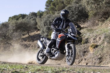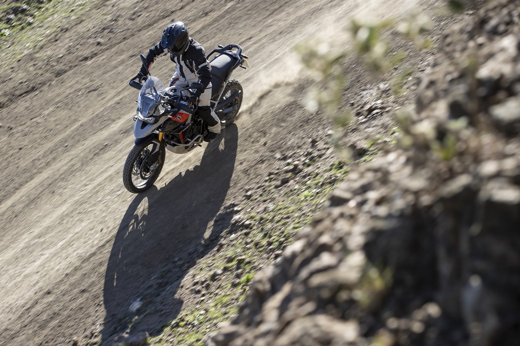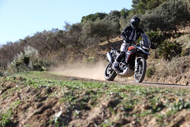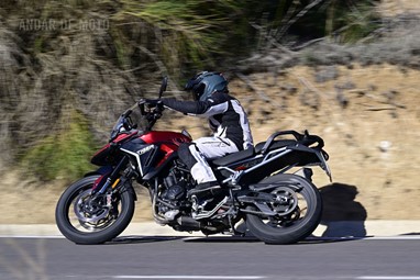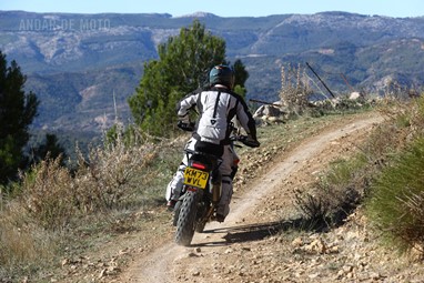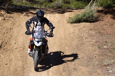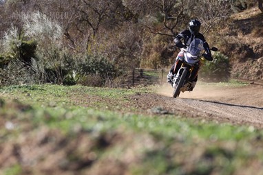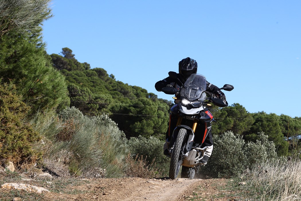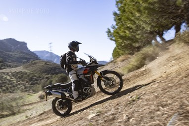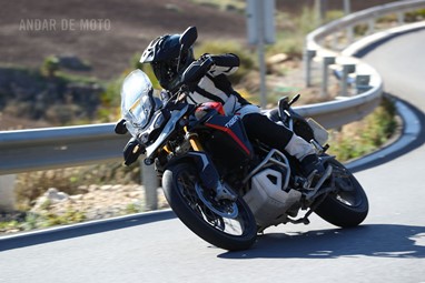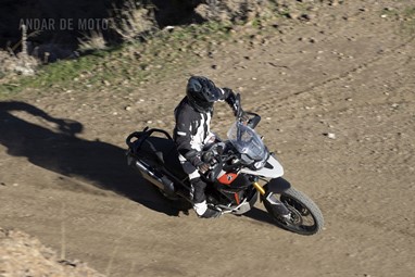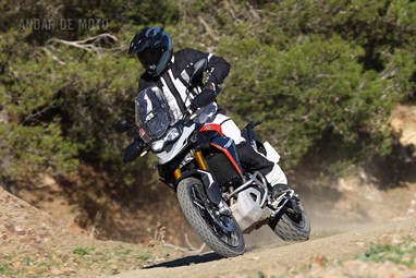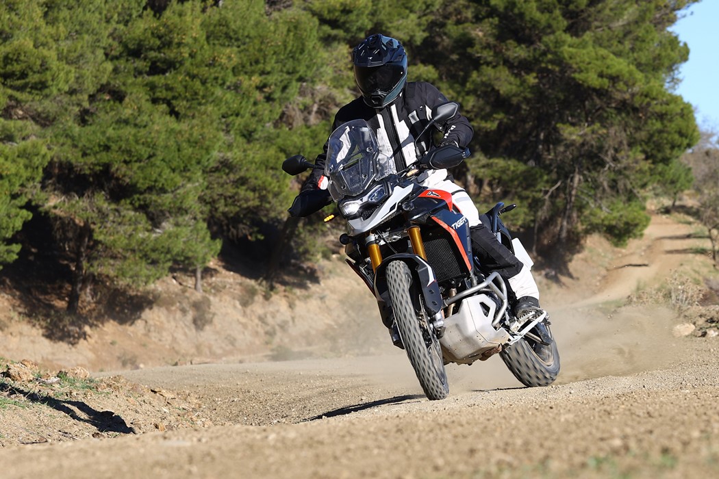 Estejamos sentados ou em pé, a Tiger sente-se bem dimensionada debaixo de nós, sem exageros volumétricos ou desequilíbrios no centro de massa. O modo Rally (que desliga o ABS traseiro e torna o controlo de tracção mais permissivo) era o escolhido para lidar com um piso de excelência, a chuva na noite anterior tinha sido a suficiente para eliminar o pó dos trilhos, sem deixar presenças significativas de lama ou terreno escorregadio. Um mimo.