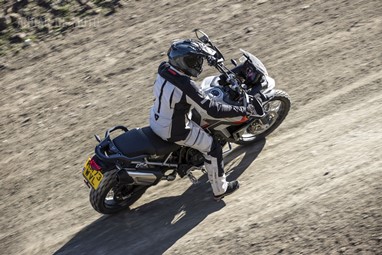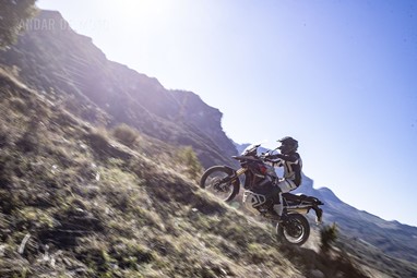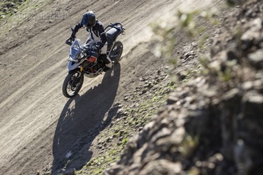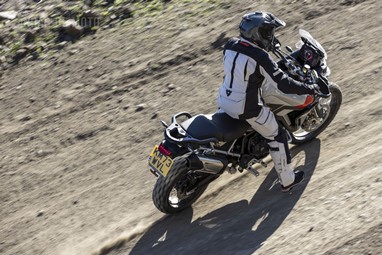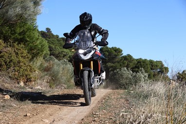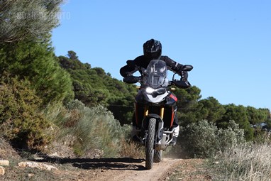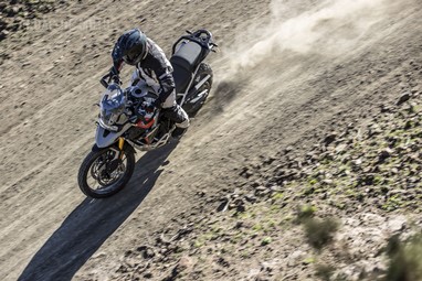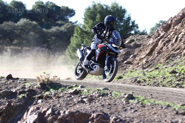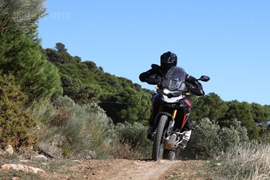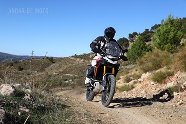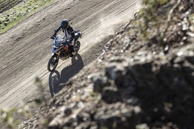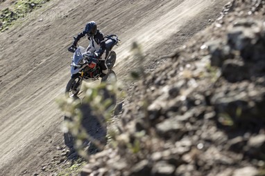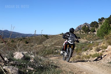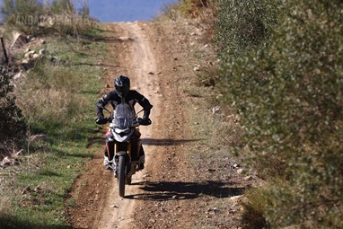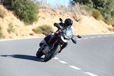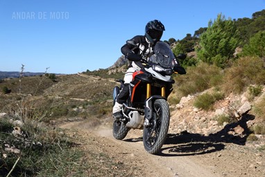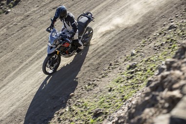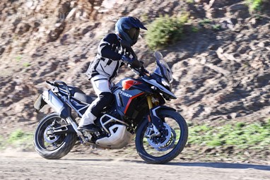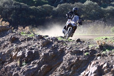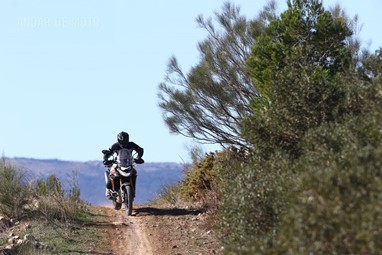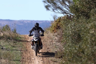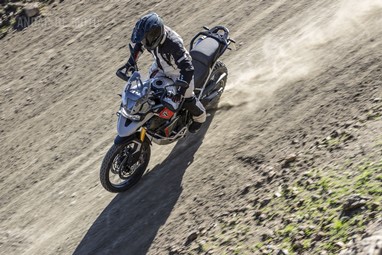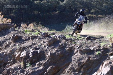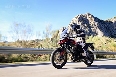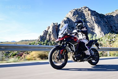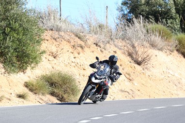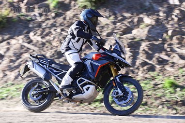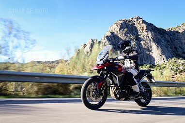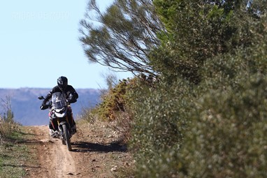 Os inputs de direcção alteram o movimento de forma bastante comedida, e a sensação de controlo sobre a máquina é uma constante ao longo de todos os cenários. A Tiger nunca foi nervosa de reações, e no fora de estrada agradecemos a facilidade com que percebemos até onde podemos ir. Chavões à parte, podemos dizer que é uma moto que sabe muito bem esconder o seu peso (são 228 Kg na versão Rally, com a protecção de cárter e as barras de protecção instaladas de origem). O novo motor começava a dar um ar de sua graça, com a resposta a sentir-se bastante mais directa do que no modelo anterior. Como se estivesse mais “solto” nos baixos regimes. Passando a clássica subida a uma zona de eólicas para poder disfrutar das vistas intermináveis até ao mar, uma descida pronunciada povoada por pedras de dimensão razoável, punha em causa o amortecimento e colocava questões importantes à gestão de inércia em andamento - quase unicamente - gravítico.