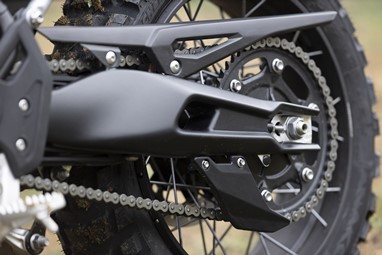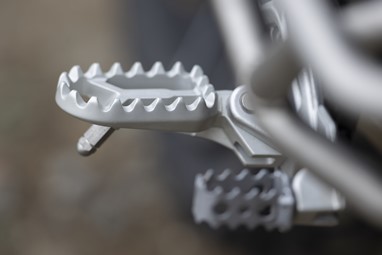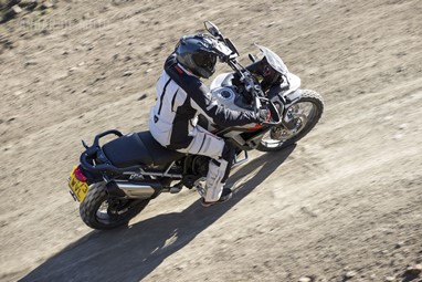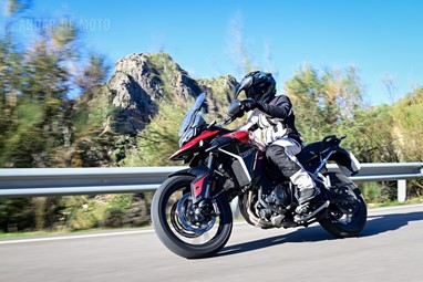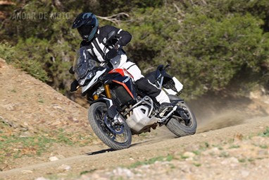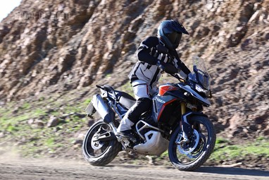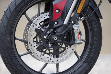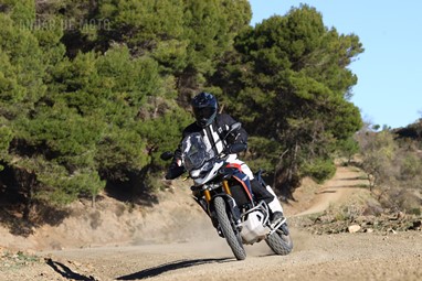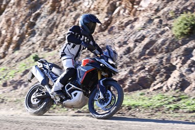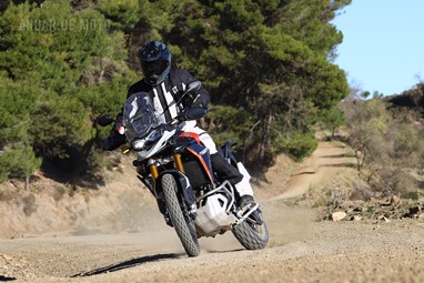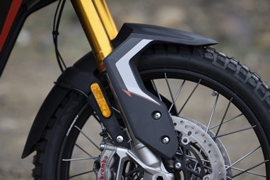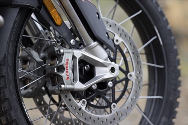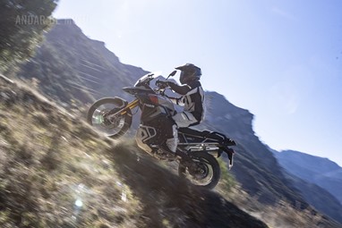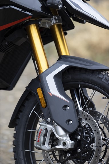 As suspensões Showa totalmente ajustáveis são um dos pontos fortes deste modelo. Conseguimos acertar a compressão e a extensão no eixo dianteiro sem recurso a ferramenta, e o seu funcionamento é sofisticado e com uma grande margem de progressão na leitura do terreno. Um pisar seguro e estável que potencia a confiança nos momentos mais dificeis.