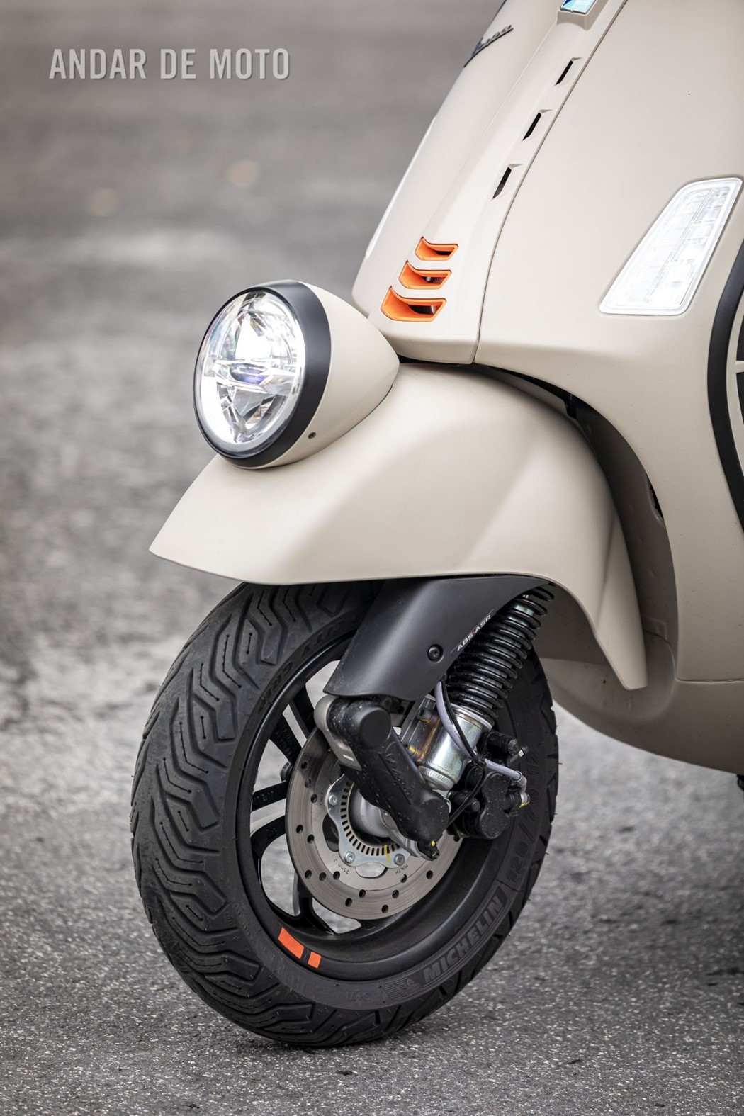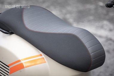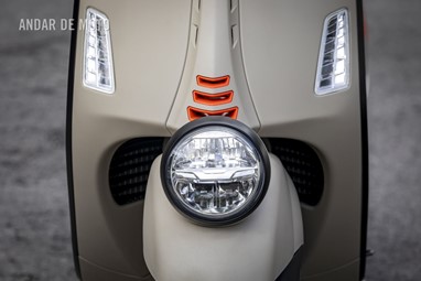Dando dois passos atrás voltamos a apreciar a bonita cor bege (de seu nome “Beige Avvolgente Opaco”, estando disponível também num “Preto Convinto”) com apontamentos cor de laranja, e a agradecemos a escolha dos detalhes em preto nas molduras dos faróis (iluminação full LED), na tampa do escape, no guiador, nos poisa-pés do pendura embutidos… Fechamos as mãos com os dedos comprimidos em direcção ao céu e entre sorrisos dizemos: “Belíssima”!!