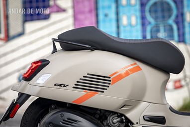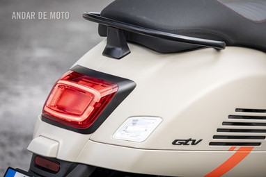 Dando expressão ao movimento, a baixas velocidades a GTV mostra-nos toda a sua vontade de agradar. A posição de condução é característica de uma Vespa moderna, seguimos altivos numa postura mais clássica que desportiva. O assento é espaçoso e confortável (e muito bem acabado, com a costura laranja a delimitar os dois tecidos), embora não seja convidativo a grandes tiradas com pendura.