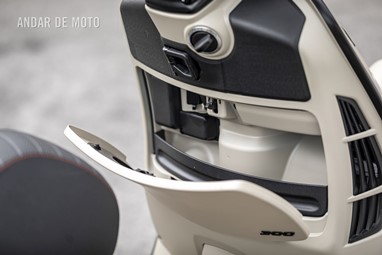 No compartimento frontal encontra-se um carregador USB e podemos também guardar pequenos volumes (chaves, carteira, etc), sendo que este fica trancado se assim o desejarmos. O exíguo espaço debaixo do assento é equivalente ao que encontramos na restante família, conseguindo albergar um capacete aberto e pouco mais do que um par de luvas.