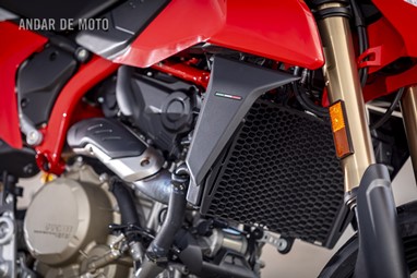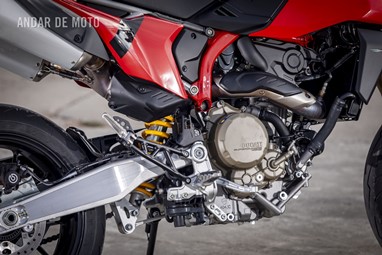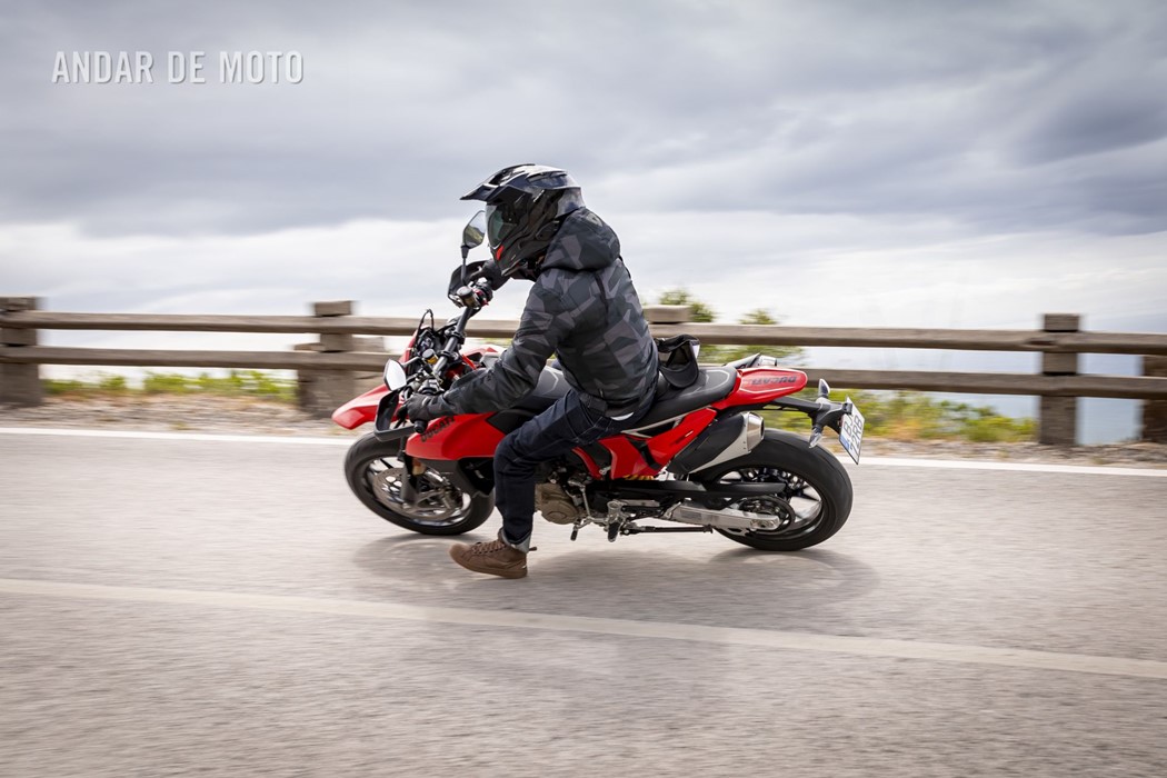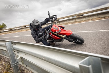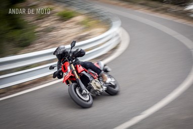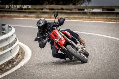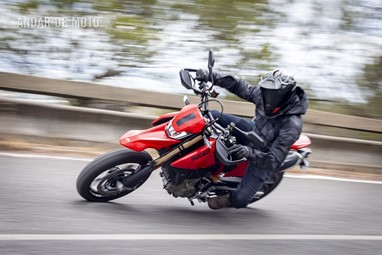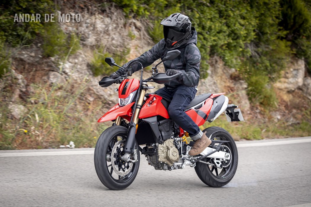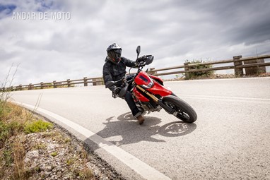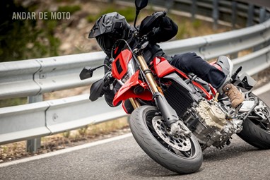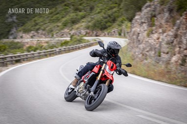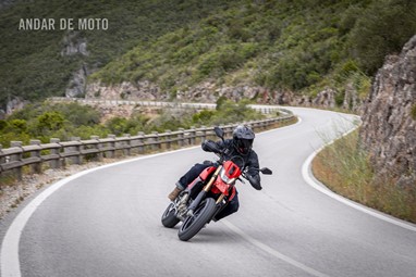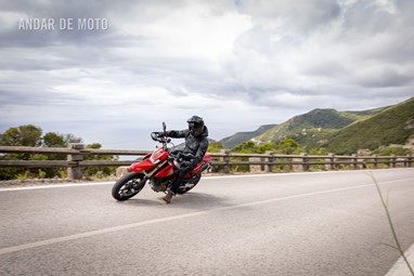 Todo o trabalho das suspensões e da travagem, seja pelo refinamento na leitura do piso, seja pela capacidade de conseguirmos transformar a acção milimétrica da manete em potência de actuação, estão acima de qualquer reparo. Esta Hypermotard está longe de ser um bisturi, porque a sua natureza irrequieta não lhe permite, mas consegue acertar as trajectórias todas. O problema reside na sua capacidade de nos querer tirar do sério. Eu considero-me alguém que gosta de pilotar certinho, de minimizar o erro baseado na tolerância que o contexto me entrega, ou seja, na fronteira do razoável, tentar proteger-me o suficiente para conseguir saber onde está o seu zénite. Esta moto pede o caos controlado e, por demasiadas vezes, leva a sua avante (seja com joelho técnico com perfume de circuito ou com perna esticada a fingir que vamos a roçar o calcanhar nas pedras…).
