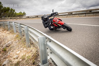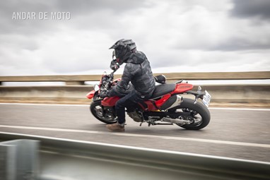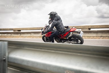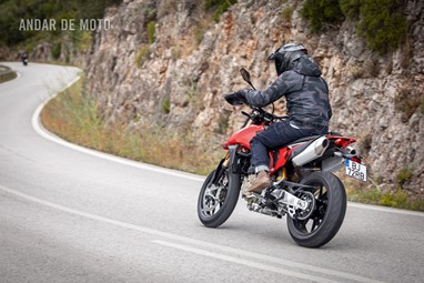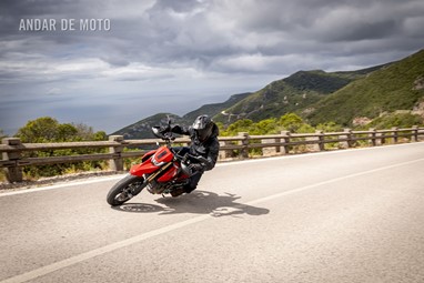 Serra abaixo, serra acima, fomos chegando a um consenso. Travando cada vez mais tarde, a sua vontade de soltar a traseira revelava uma latente propensão para o desequilíbrio. Da mesma forma, nas saídas de curva em potência, a roda dianteira levitava sem grande esforço, muito graças ao trabalho árduo do pequeno grande motor (Monocilíndrico com 659 cc, debitando 77,5 cv às 9750 rpm e 63 Nm às 8000 rpm), que mesmo com um isolado cilindro gosta de mostrar a sua raça.