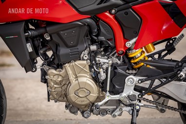 Qualquer moto desta tipologia tem uma presença visual que nos assalta os sentidos. A aparente incongruência nas soluções propostas e a sua agressividade mecânica são dois factores que nos põem em alerta. O porquê de alterar a estrutura típica de uma moto de todo o terreno para uma configuração asfáltica, sugere uma saudável loucura, onde o disparate ganha tons de seriedade. Jantes de liga montando pneus de asfalto (neste caso uns Pirelli Diablo Rosso IV), suspensões de menor curso com afinação desportiva (aqui temos uma forquilha Marzochi com um diâmetro de 45 mm e um monoamortecedor Sachs a trabalhar sobre um braço oscilante em alumínio), ambas totalmente reguláveis, e uns travões sobredimensionados (um gigantesco disco dianteiro de 330 mm de diâmetro mordido por umas pinças Brembo M4.32) dão-nos fortes indicações de que esta menina gosta de se portar mal. Alta, esguia e espartana nos artifícios, a sua estética (com a versão RVE, de decoração mais agressiva e com quick-shifter de série) ganhou o prémio de moto mais bonita da EICMA. Não posso deixar de concordar, não consigo deixar de lhe admirar as formas.