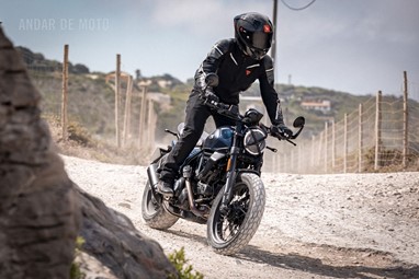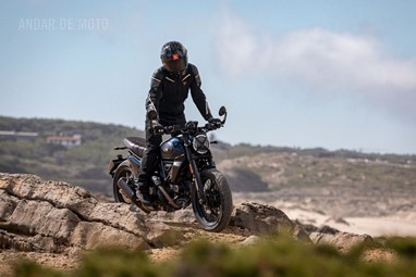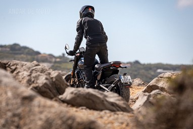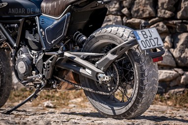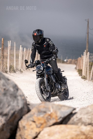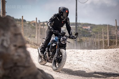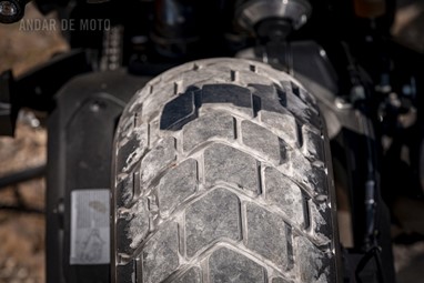 Os pneus Pirelli MT60, com um visual off-road, funcionam surpreendentemente bem em várias condições, oferecendo boa aderência e confiança ao motociclista. A leveza e agilidade da moto, combinadas com a suspensão equilibrada, tornam-na muito divertida de conduzir.