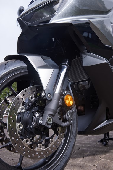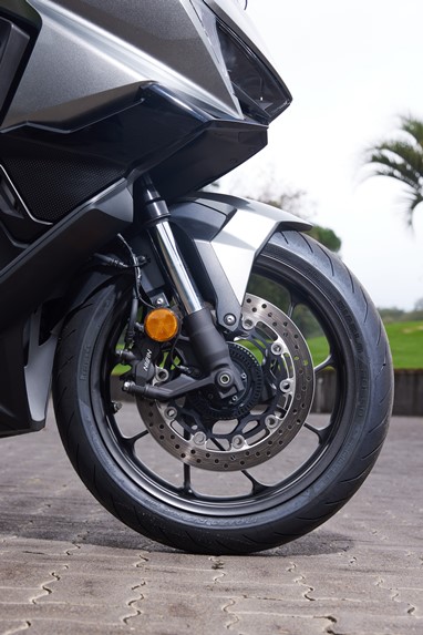 A ciclística serve-se de um quadro sem grandes torções e o funcionamento da suspensão revela-se “suavemente desportivo”. Tem as suas oscilações controladas e permite fazer brilhar os Bridgestone A41 com um bom feedback no que toca ao atrito no tapete asfáltico.