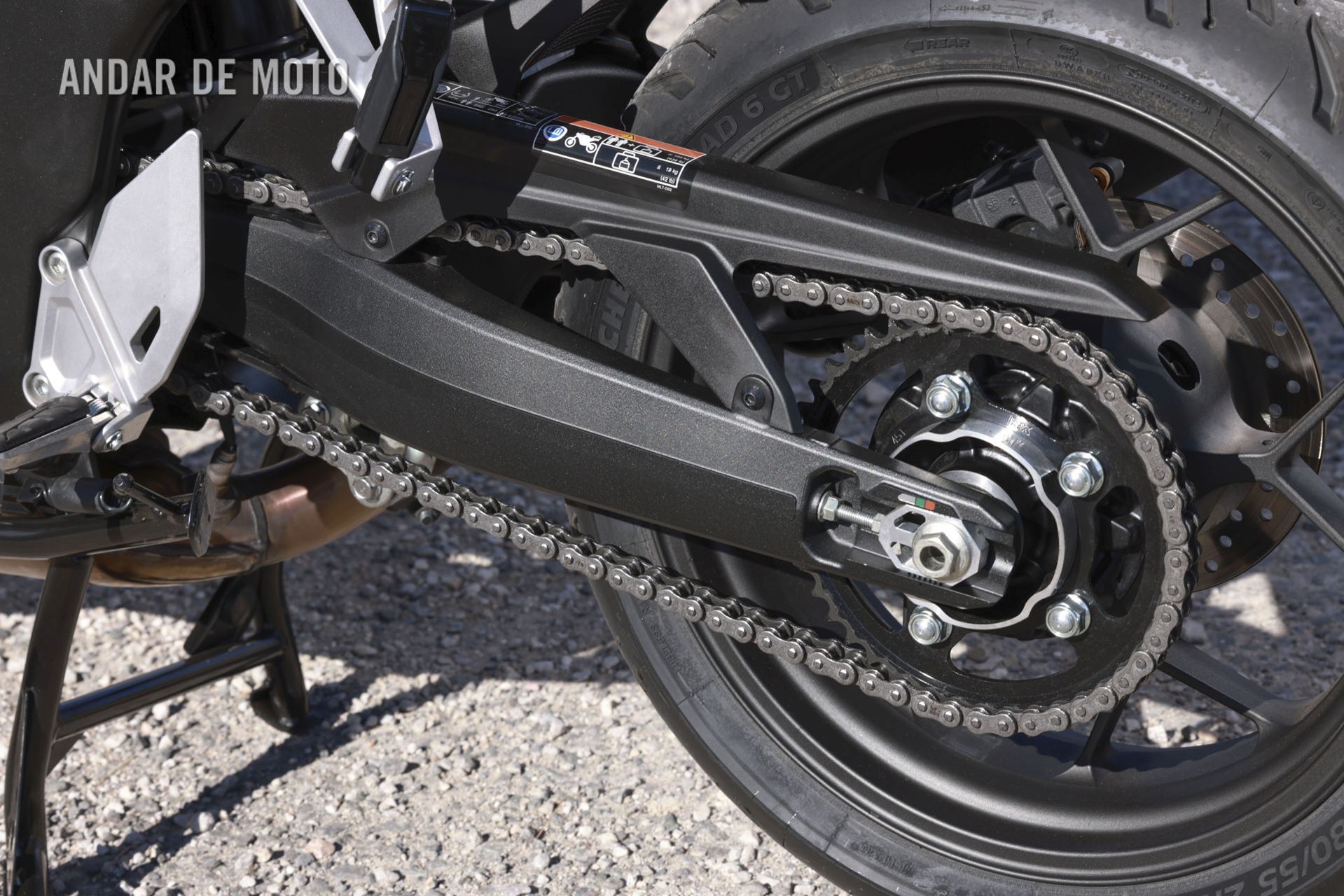 Continuando com os atributos turísticos tenho de referir o facto de a “GT” vir equipada com cavalete central, bastante fácil de utilizar, que permite efectuar facilmente a lubrificação da corrente de transmissão e estacionar com mais segurança.