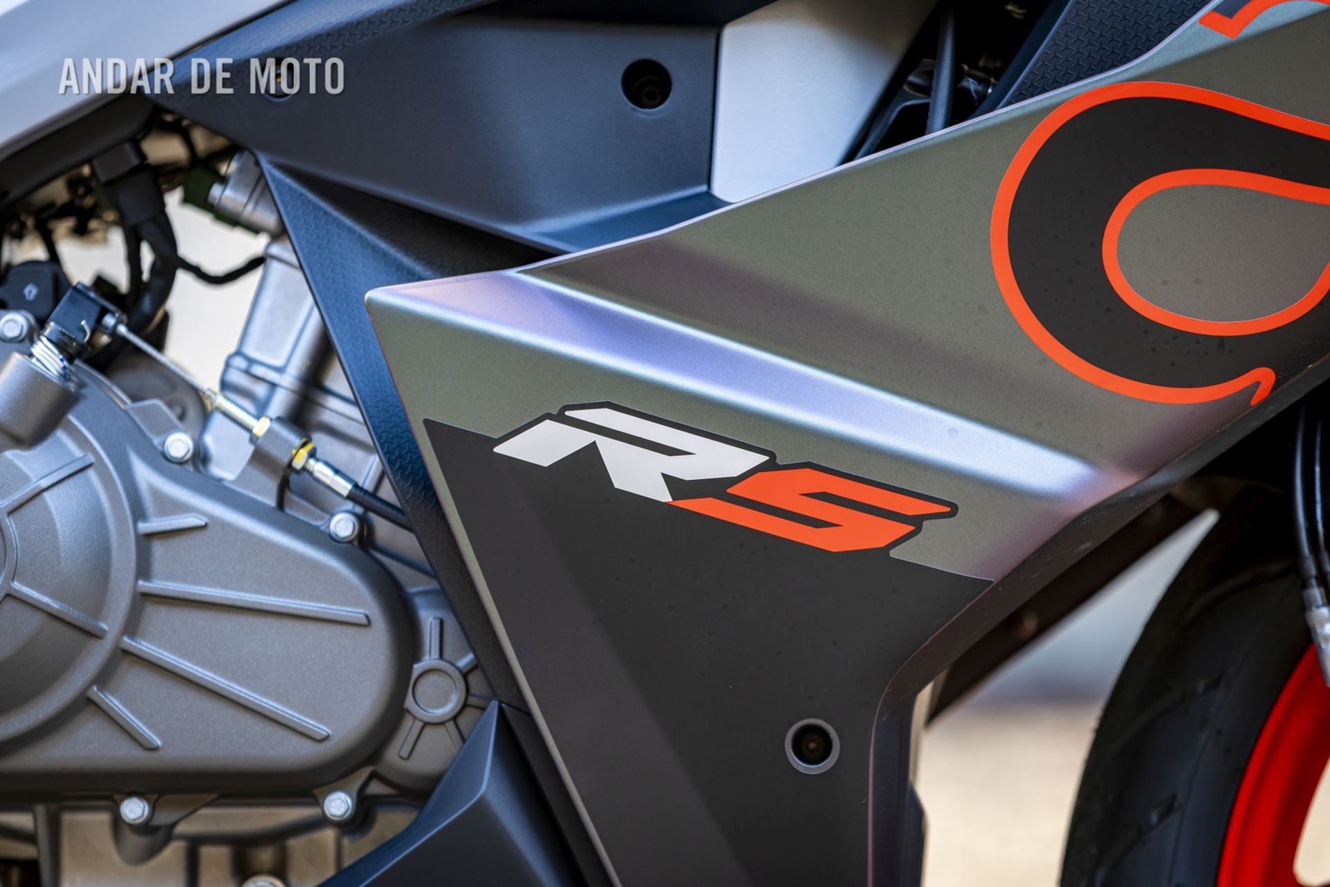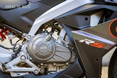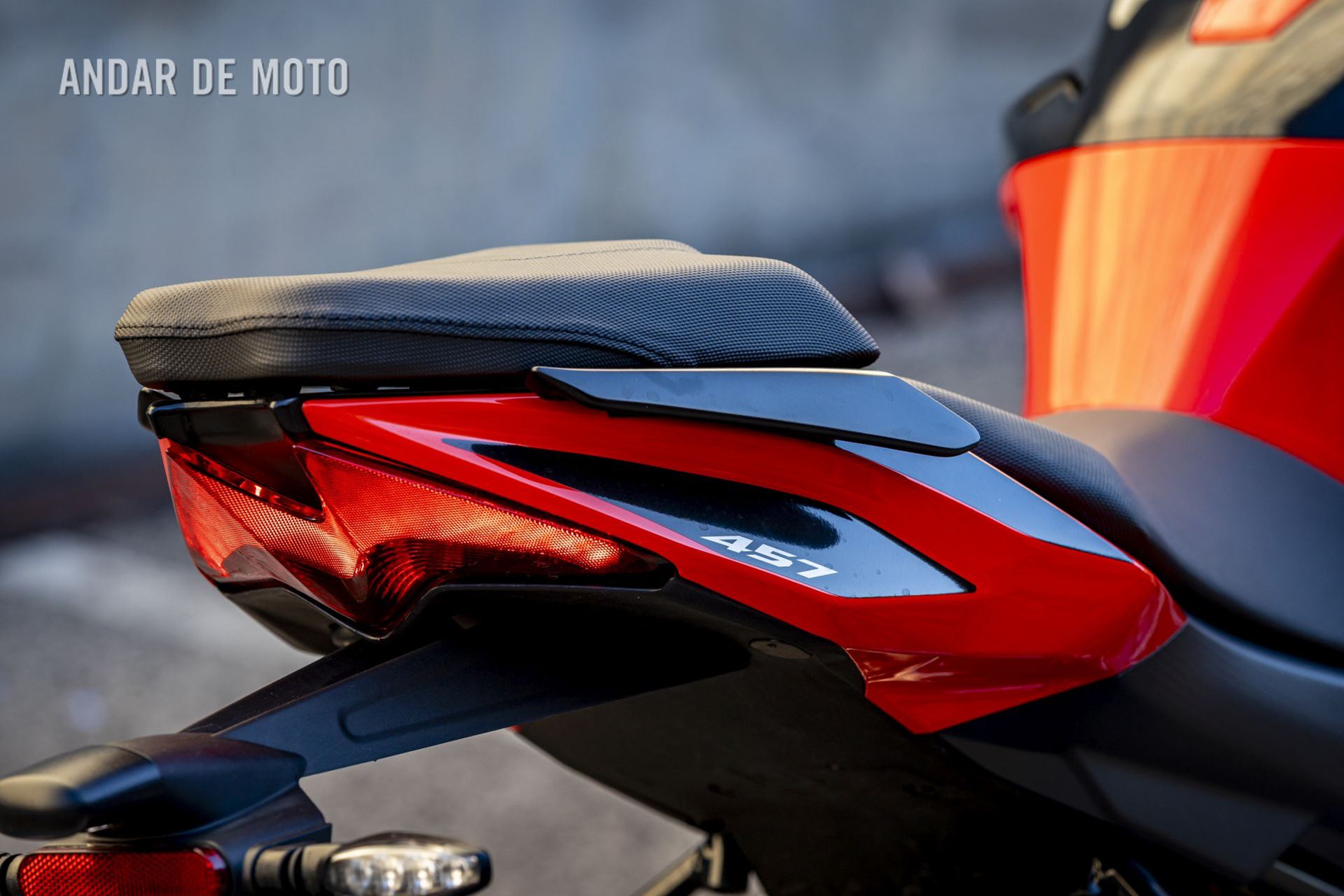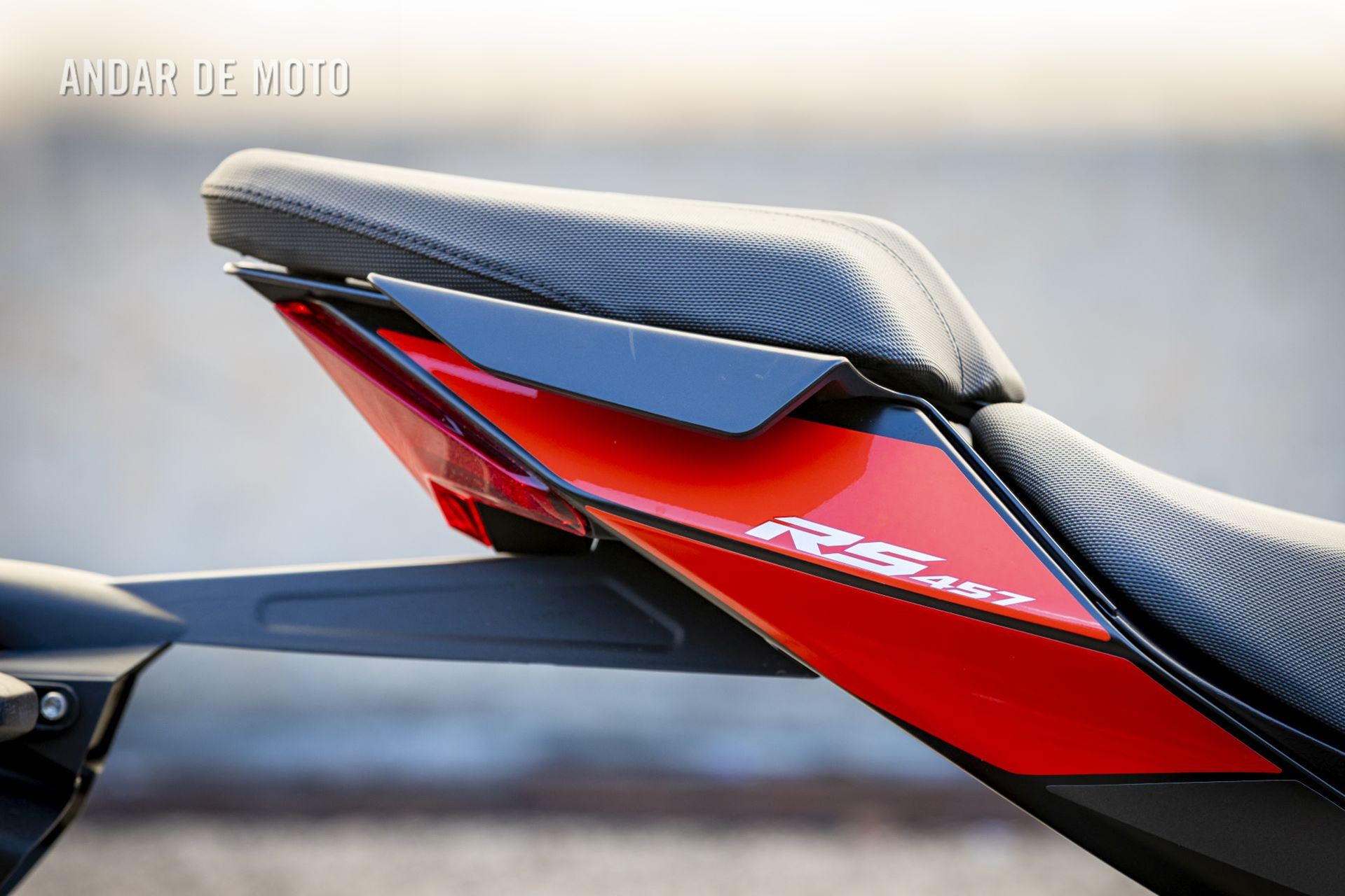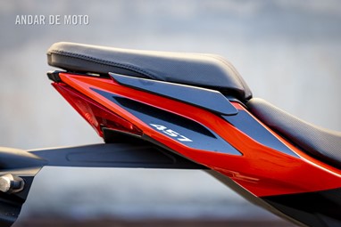 Ela glorifica a resposta imediata e limpa do motor e fala muito da relação peso-potência imbatível da sua RS457 e do excelente comportamento da suspensão que, com 120mm de curso na frente e 130mm na traseira, ajustável em pré-carga, mantém as rodas bem coladas ao asfalto.