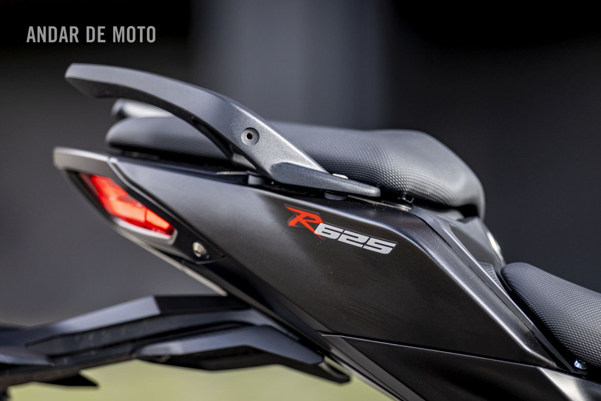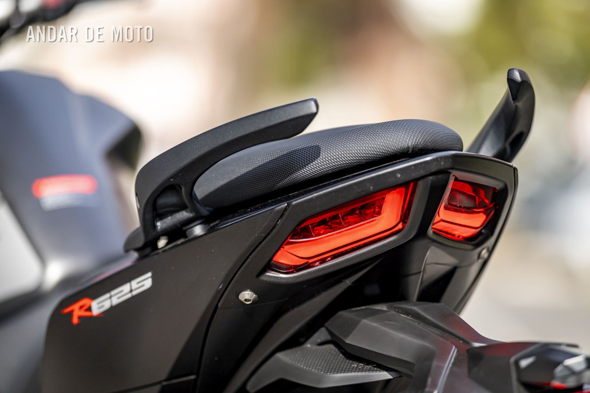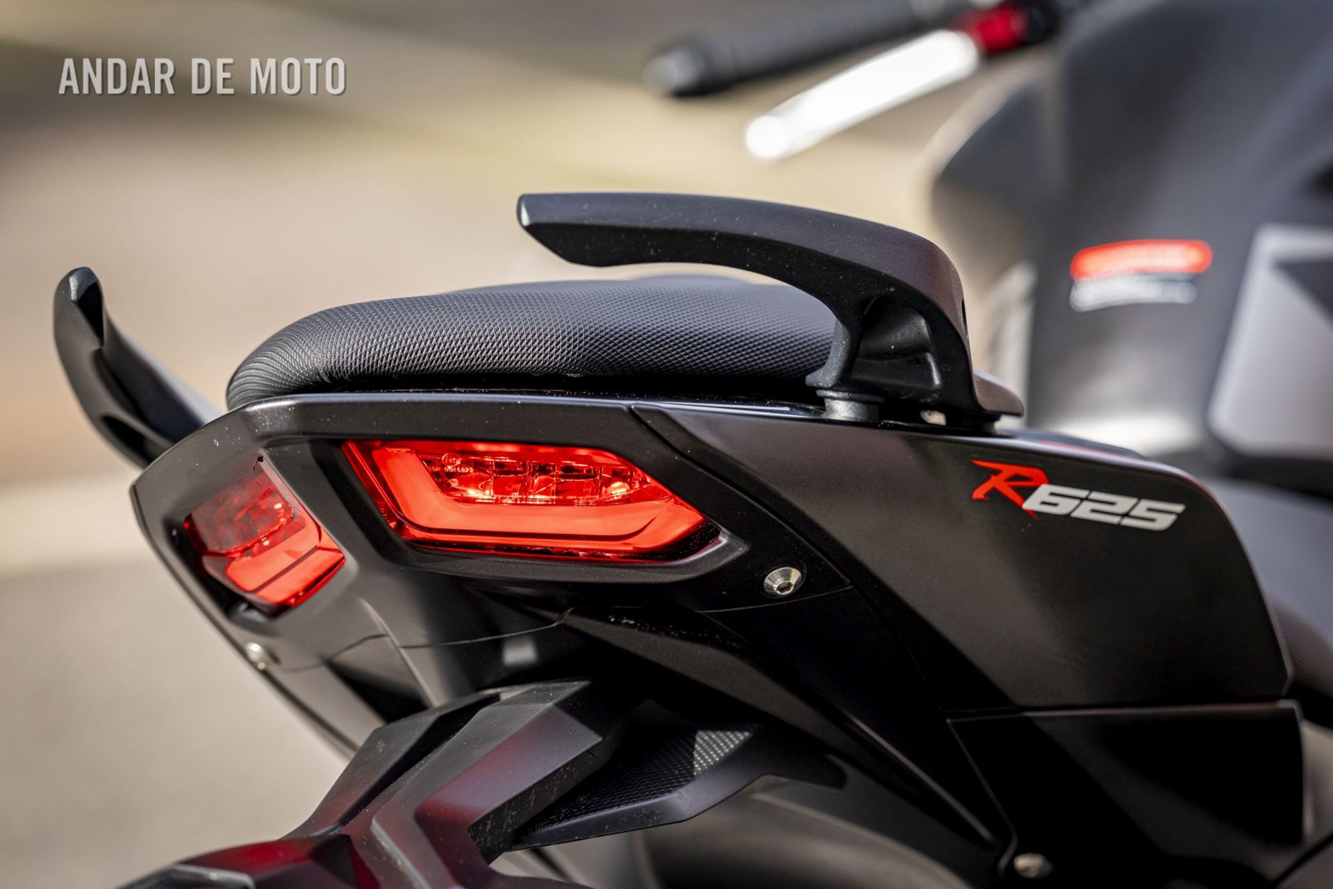 Sendo o topo da hierarquia, em que existem também a 125R e a 525R, a 625R mantém os ares de família, notando-se que houve um certo cuidado em a distinguir das suas irmãs menos espigadas. Mas o maior fator de distinção não se vê diretamente. Estamos a falar obviamente do motor, que conhecemos da 625 DSX, mas já lá vamos.Minimalista, dominada por uma frente acutilante, quase provocadora, esta moto consegue ter proporções equilibradas, com umas linhas esguias e angulosas, rematadas por uma traseira quase desportiva. Deixa até bem à mostra o pneu traseiro e a volumosa ponteira de escape, em posição ligeiramente elevada.